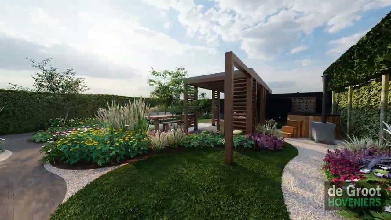 Organische vormen met verschillende materialen komen in deze tuin samen tot een geheel. Zo wordt er gebruik gemaakt van gebakken klinkers, split, tegels, gazon en beplanting. In evenwicht is dit uitgewerkt tot een tuinontwerp waarin de wensen van de klant terugkomen. Een loungegelegenheid onder de overkapping samen met eetgelegenheid zorgt ervoor dat vrienden en familie samenkomen op een plek. Aansluitend kunnen ze ook samenkomen in de hottub. In de avond wordt de beplanting uitgelicht door de In-Lite Sways en onder de meerstammige bomen worden Scopes geplaatst, zodat deze ook in de avond gezien worden.