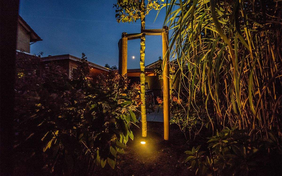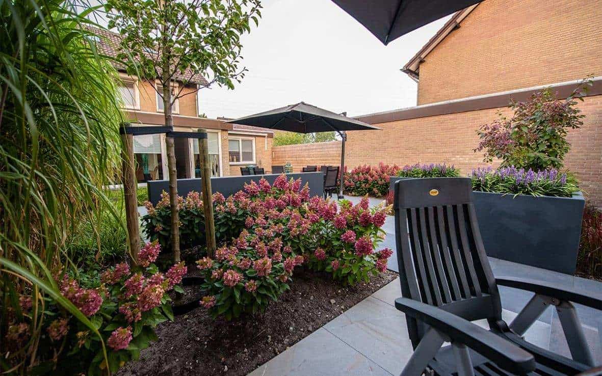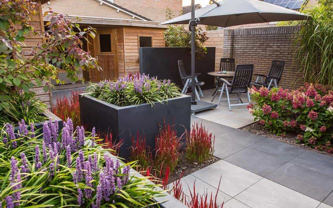 In Uden hebben we deze moderne achtertuin gerealiseerd. Dit is een tuin waarin duidelijk de moderne kenmerken terug zijn te vinden door het lijnenspel en de materialen die gebruikt zijn. Rust en eenvoud spelen hier de boventoon. De materialen zijn uiterst onderhoudsvriendelijk, keramische tegels, polyester plantenbakken en muren en onderhoudsvriendelijke eenvoudige beplanting. De elementen in de tuin worden bij het ondergaan van de zon ook prachtig uitgelicht.