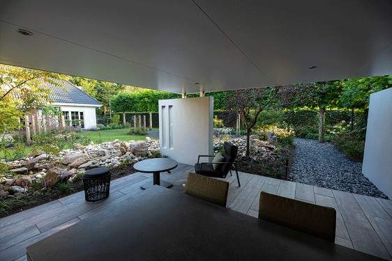 Bij het ontwerp dienden de strakke lijnen van de woning als basis. Strak is de bestrating tegen de gevel. Een breed pad voor de rolstoel goed begangbaar. De echte eyecatcher in de tuin is toch wel de overkapping met ruim terras. De wanden, de boeiboorden en het dak zijn op maat gemaakt van polyester. Het oogt hierdoor als stucwerk maar is vriendelijker in onderhoud omdat het gemakkelijk schoonmaken is, en het is kleurvast. De binnenwanden zijn bekleed met hout om een warme en natuurlijke uitstraling in de overkapping te creëren. Het terras is omsloten door beplanting waardoor er nog meer sfeer ontstaat.